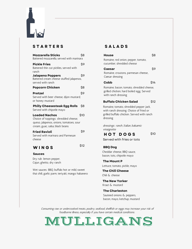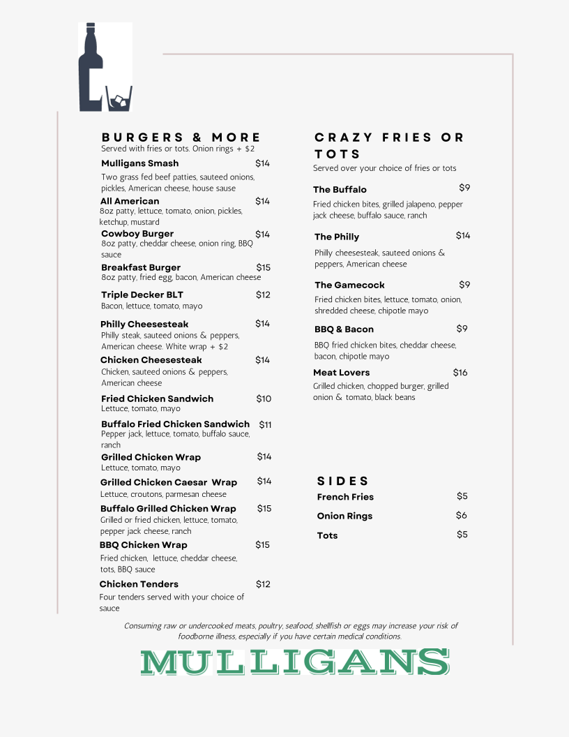 Welcome to Mulligans - North Charleston, a vibrant hotspot located at 8410 Rivers Ave Suite B. This lively eatery offers a menu brimming with flavor and comfort, perfect for any craving. Whether you’re stopping by for a late-night snack or a hearty lunch, Mulligans has you covered.